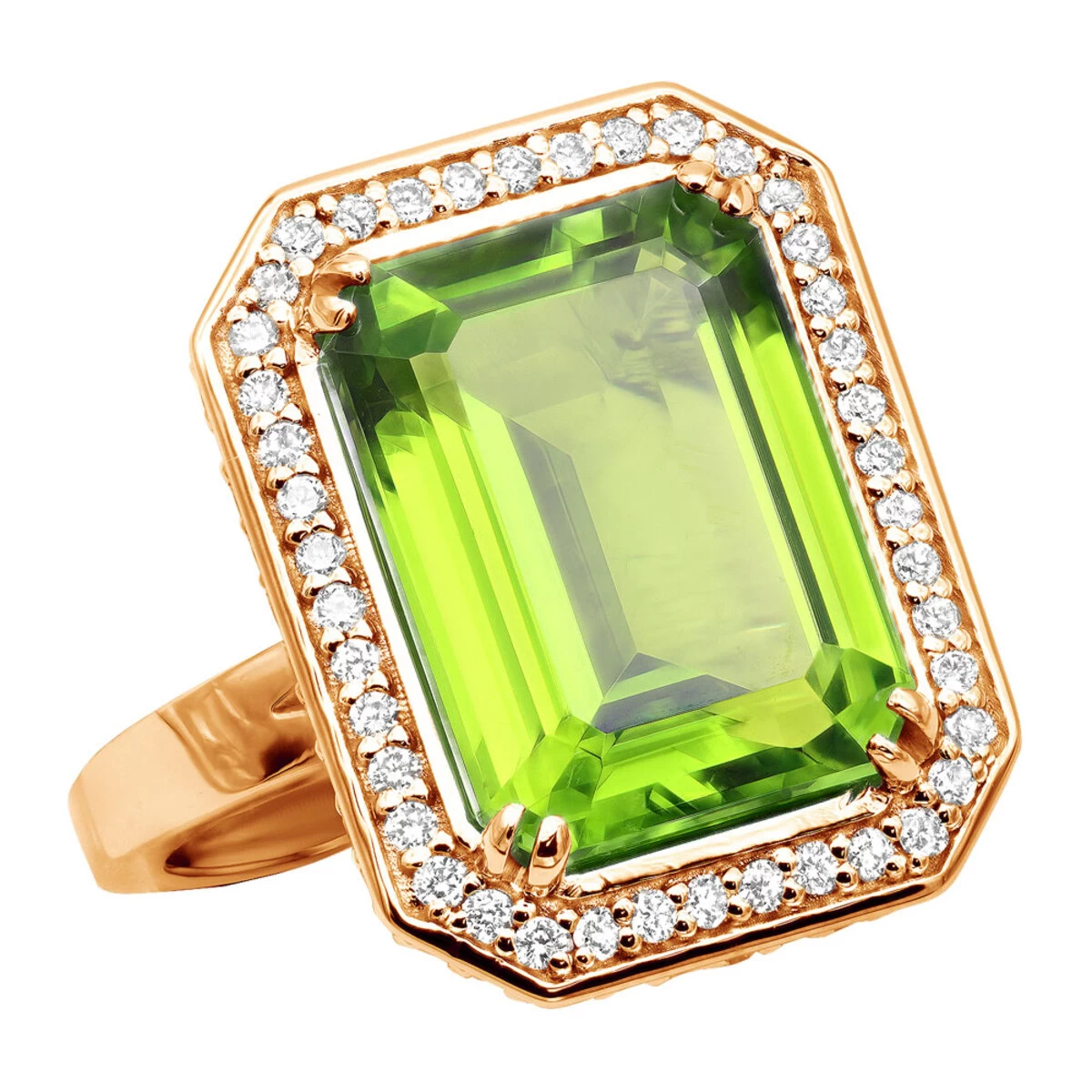 This 14K Gold Diamond Peridot Quartz Cocktail Ring weights weighs approximately 9 grams and showcases a fabulous 13-carat peridot quartz and 1.6 carats of sparkling round diamonds. Featuring a unique design and a highly polished gold finish, this ladies diamond cocktail ring is available in 14K white, yellow and rose gold.