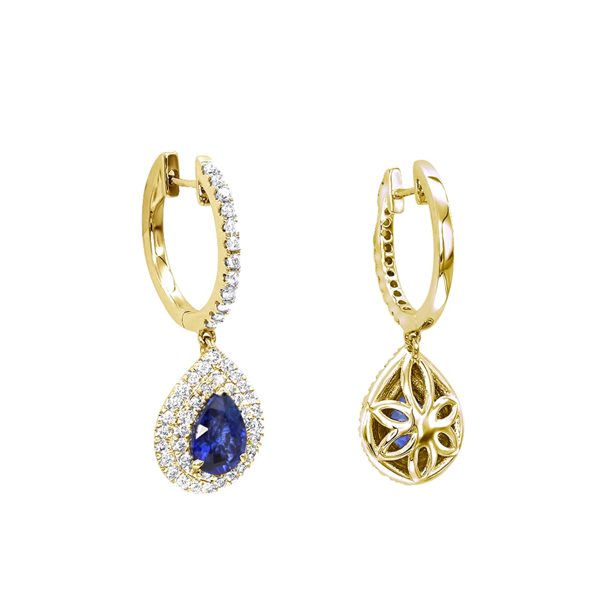 These 14K Gold Sapphire Diamond Pear Shape Drop Earrings for Women by Luxurman showcase 1 carat high quality diamonds and two 0.9 carat amazing blue sapphires masterfully set in 14K gold frame with gorgeous flower shaped gallery on the back. These ladies diamond drop earrings with diamonds and sapphires showcase superlative craftsmanship and available in white, yellow and rose 14K gold and will make great present for any occasion.