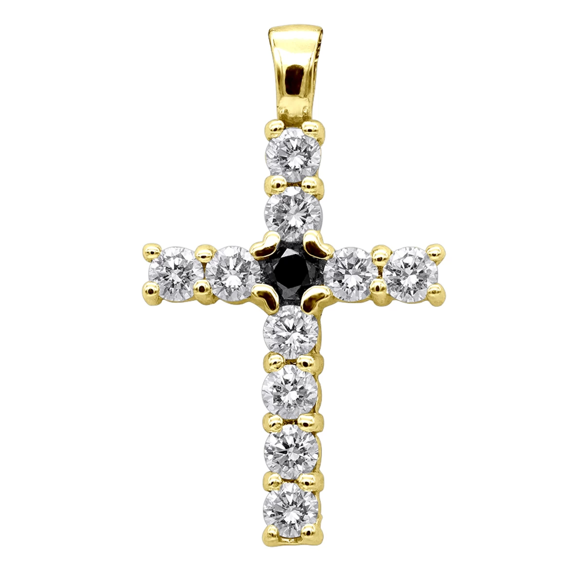 From our religious jewelry collection this fancy 14K gold white and black diamond cross pendant for men and women by LUXURMAN is just the right size at just over an inch long with bail: 1 3/16in. (29mm) or about an inch without bail, and 17mm wide, this classy yet unique diamond cross pendant showcases a single black diamond in the middle and white diamonds around it on the sides on of the cross, total carat weight of diamonds is 1.33 carats. A timeless symbol of faith, this diamond cross pendant necklace is a versatile choice that can be worn with a variety of looks. Available in 14k white, yellow and rose gold as well as can be made as a custom order in 18k gold and Platinum. You also can personalize this piece or check we’ve already made and create your own design.