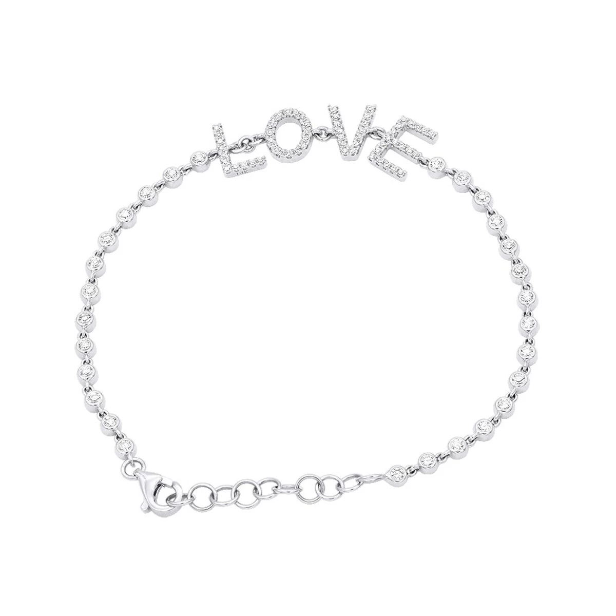 From our ladies diamond bracelets collection this this inline diamond tennis bracelet for women with LOVE lettering is made in solid 14K Gold weighs approximately 5 grams and showcases numerous sparkling white round diamonds. Featuring a modern tennis bracelet design with precious stones illuminating each link and the expertly crafted lettering saying ‘love’, this beautiful ladies diamond bracelet features adjustable length design (from 6.8 inches to 6 inches) and is available in 14K white gold, yellow or rose gold and makes a perfect gift for any occasion.