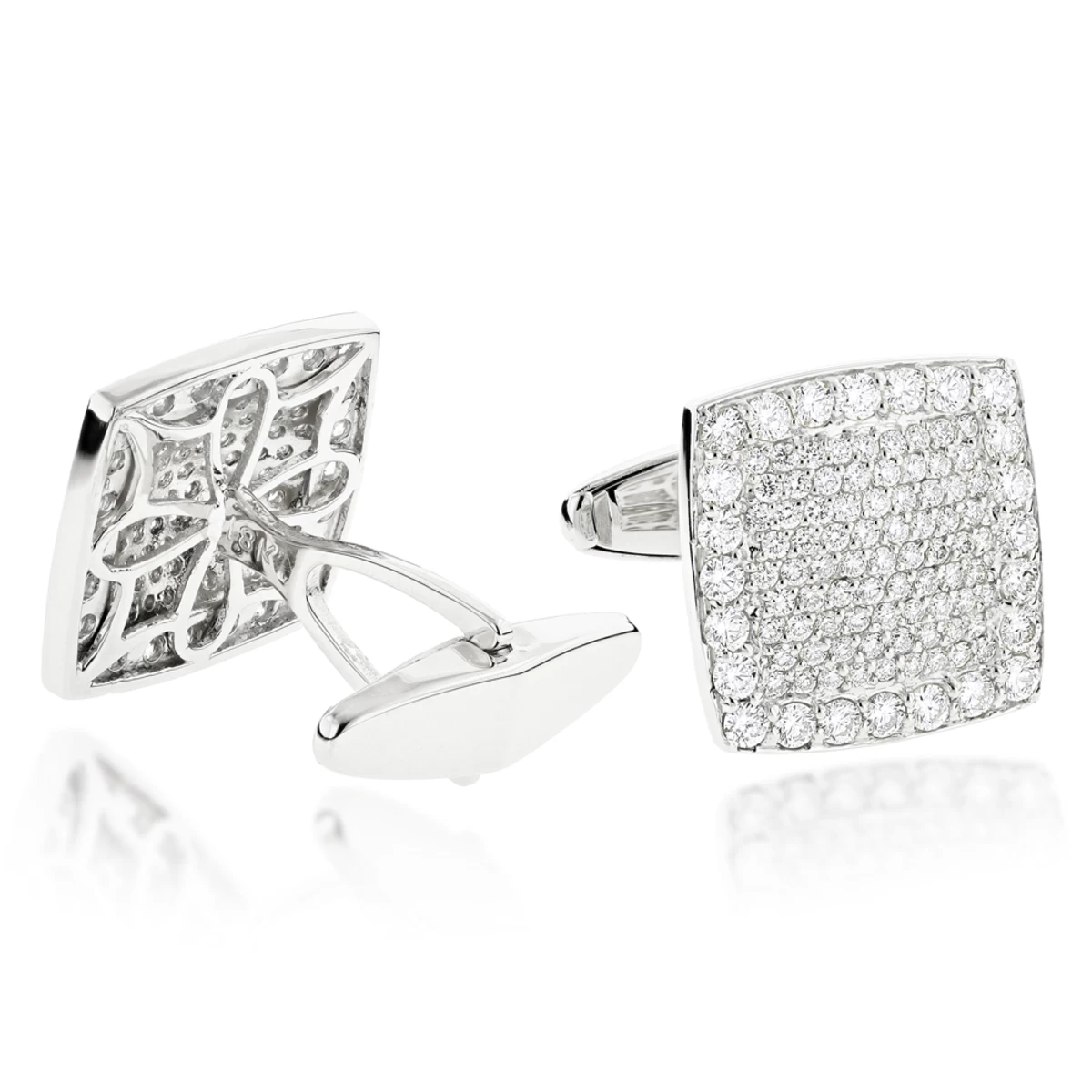 These luxurious 18K Gold & Round Diamond Designer Cufflinks – Men’s Cufflinks – weigh approximately 12 grams and showcase 3.77 ctw of dazzling round diamonds, each expertly pave set in lustrous 18K gold. Featuring an exquisite fully paved design and a highly polished gold finish, these beautiful men’s designer cuff links are available in 18K white, yellow and rose gold.