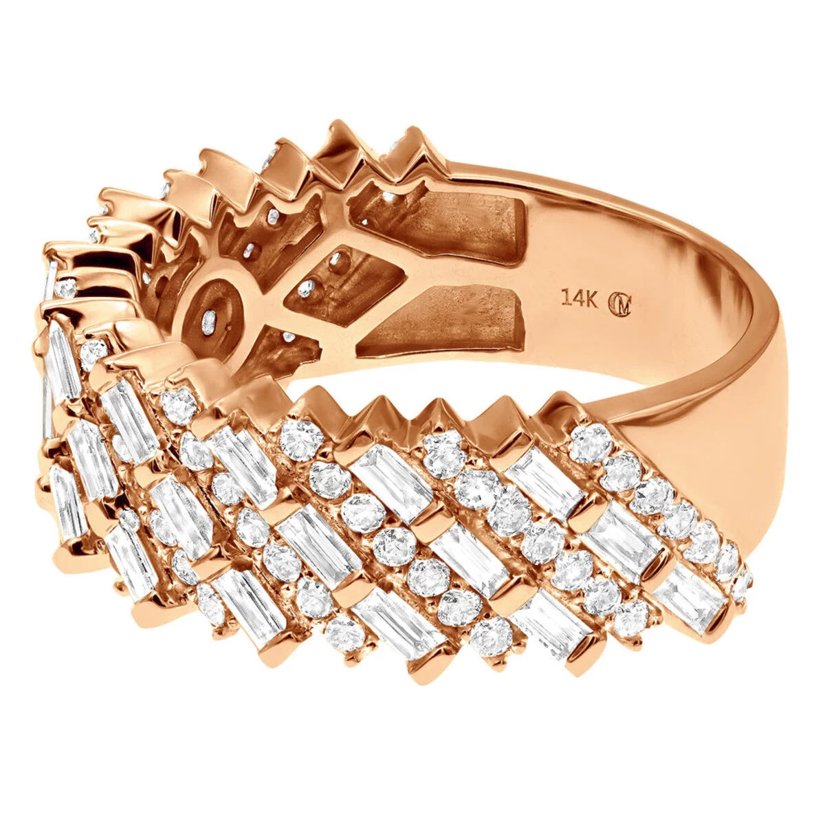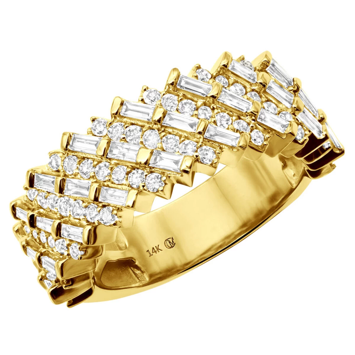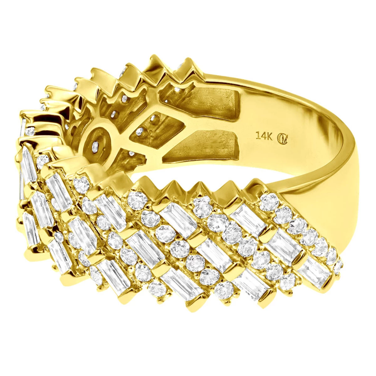 New in our diamond rings for women collection, this Ladies Round and Baguette Diamonds 14K Gold Ring by Luxurman makes a very unique wedding wand and presents a sophisticated combination of different diamond cuts. Meticulously set in diagonal rows, this band is a glittering gift of truest love and will make a perfect wedding band or a cocktail ring. Featuring a fabulous design and a highly polished gold finish, this ladies diamonds band is 3/8in (8mm) wide and weighs approximately 10 grams. Available in 14K white, yellow and rose gold.