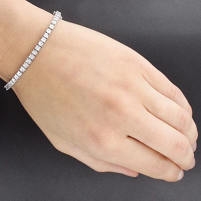 This Affordable Diamond Tennis Bracelet in Sterling Silver weighs approximately 11 grams and showcases 0.2 carats of round diamonds. Featuring a versatile design and a luxurious rhodium plating for extra shine, this ladies diamond bracelet is an affordable alternative to expensive gold jewelry.