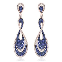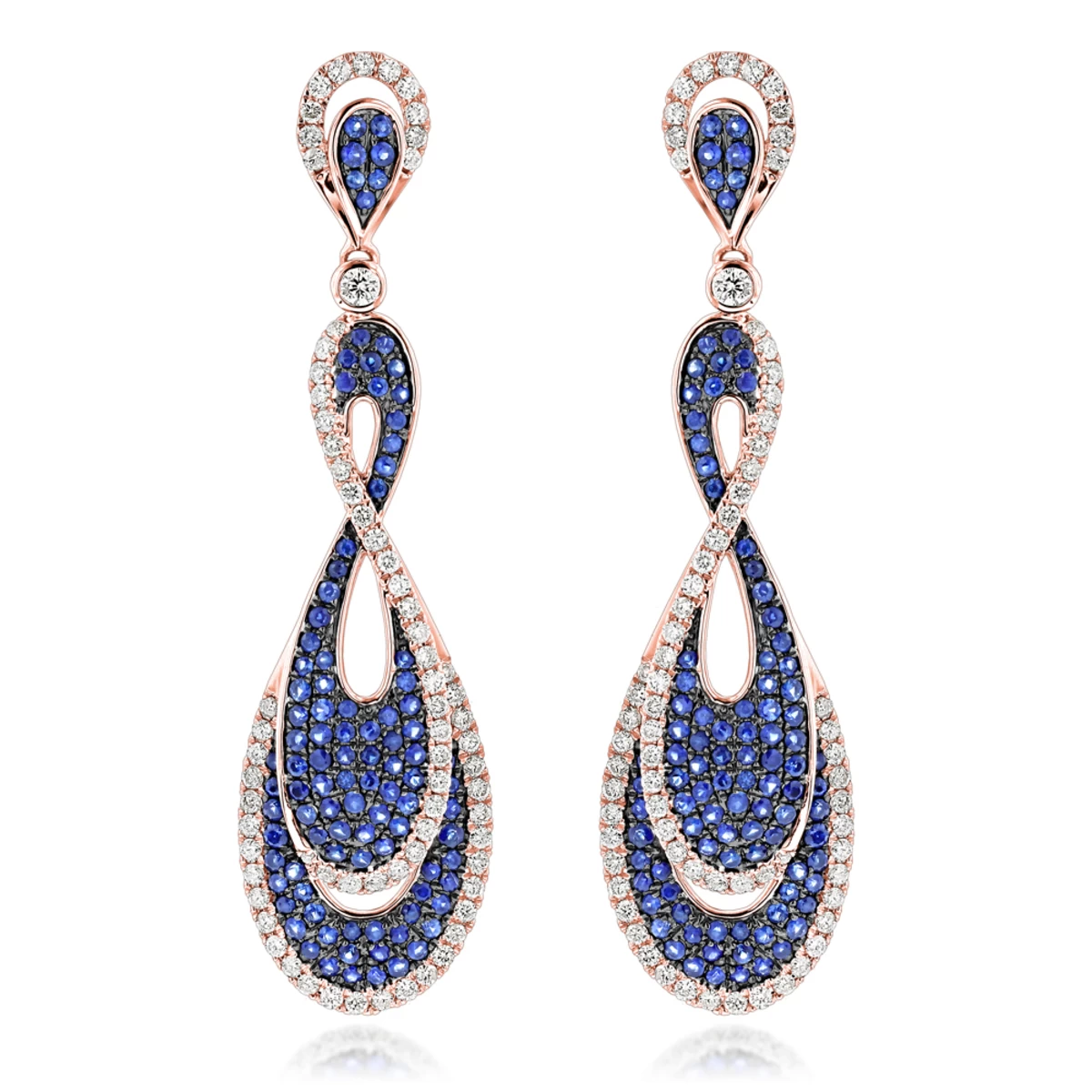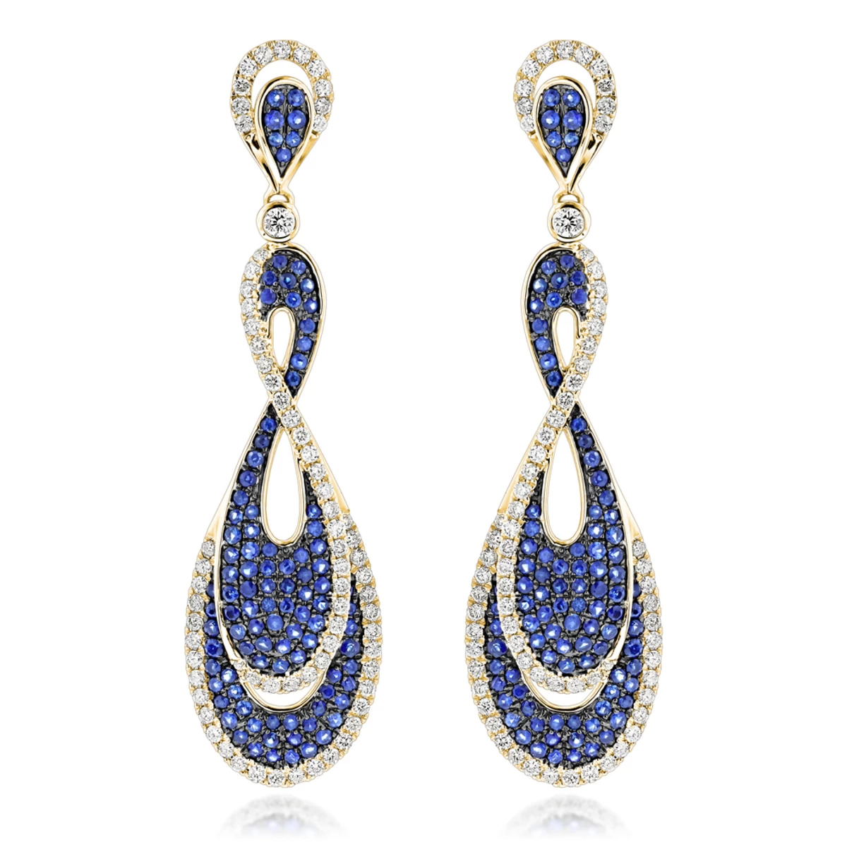 These Blue Sapphire Diamond Ladies Infinity Earrings by Luxurman showcase an outstanding unique design and feature 1 1/2 carats of high quality dazzling diamonds and 2 1/2 carats of blue sapphires masterfully set in 14K gold base. These unique diamond drop earrings for women combine luxury and distinctive design and will make a great present for special occasion! Available in 14K white gold, yellow gold and rose gold.