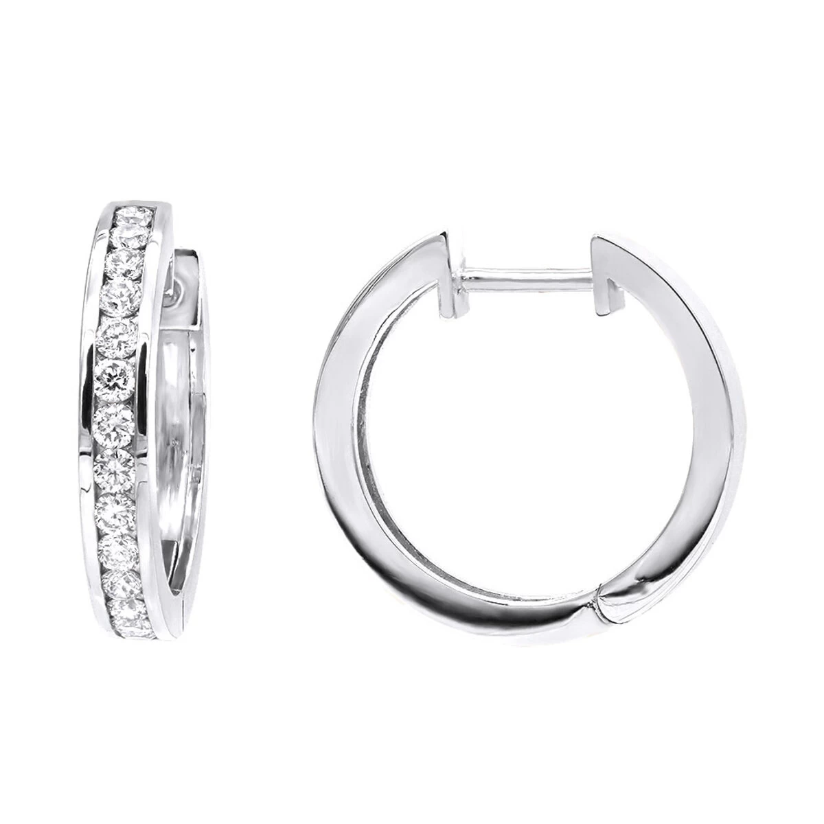 From our unisex diamond earrings collection: If you are looking for classy and multipurpose diamond gold earrings that will look brilliant with your every outfit these 0.6 Carat 1/2 inch Small Diamond Hoop Earrings in 14K Gold (also called diamond huggie earrings as they nearly hug your ear) are your great choice! Sparkling channel set white round diamonds are the centerpieces of each masterfully crafted earring. The measurements for each earring are 1/2 inch (13mm) in length and 1/8 inch (3mm) in width. Classic never goes out of style, that’s why these lovely Diamond Hoop Earrings available in 14K white, yellow and rose gold will make a perfect addition to any jewelry collection in any color. These classy diamond hoop earrings are just the right size for most ears, include a beautiful packaging and make a fabulous gift for the right occasion.