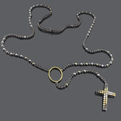 Exquisite Custom Jewelry: This Color Diamond Rosary Necklace showcases 10.25 carats of sparkling black, white and yellow diamonds, each expertly prong or bezel set in highly polished gold. Featuring a unique design, a multi-color look and a highly polished gold finish with a heavy black rhodium plating, this fabulous diamond cross chain necklace is a hot ticket item and is fully customizable. Available with different fancy color diamonds and in 10K white, yellow and rose gold, please call us for details: 212-398-3123.