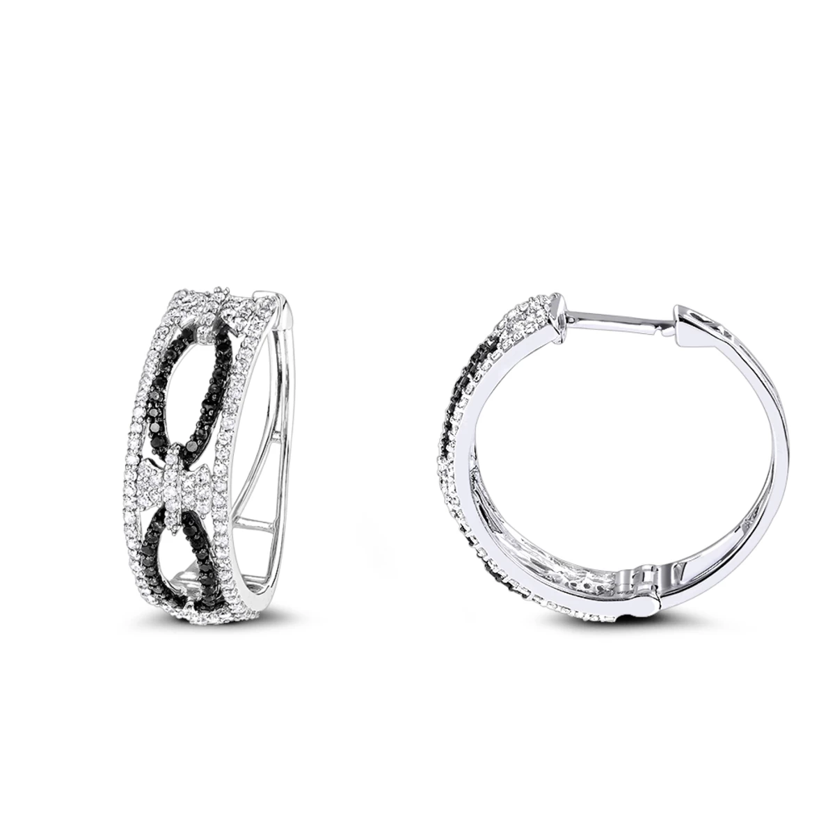 Designer White Black Diamond Hoop Earrings 0.9 Ct 14K White Gold