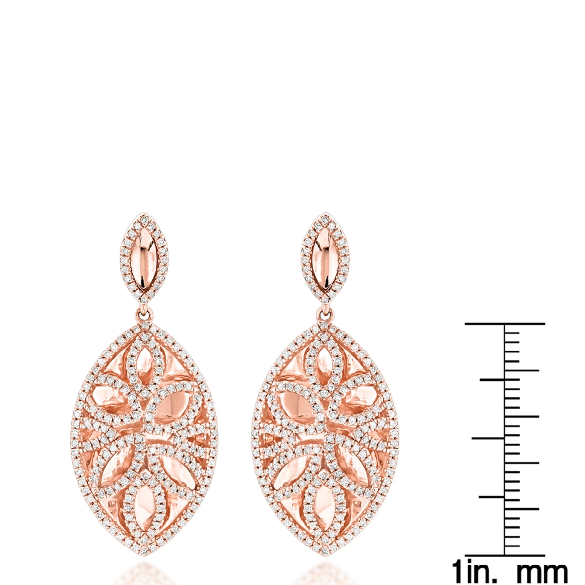 Diamond Flower Earrings For Women 14K Rose Gold Drop Earrings Leafs Design 1 Carat