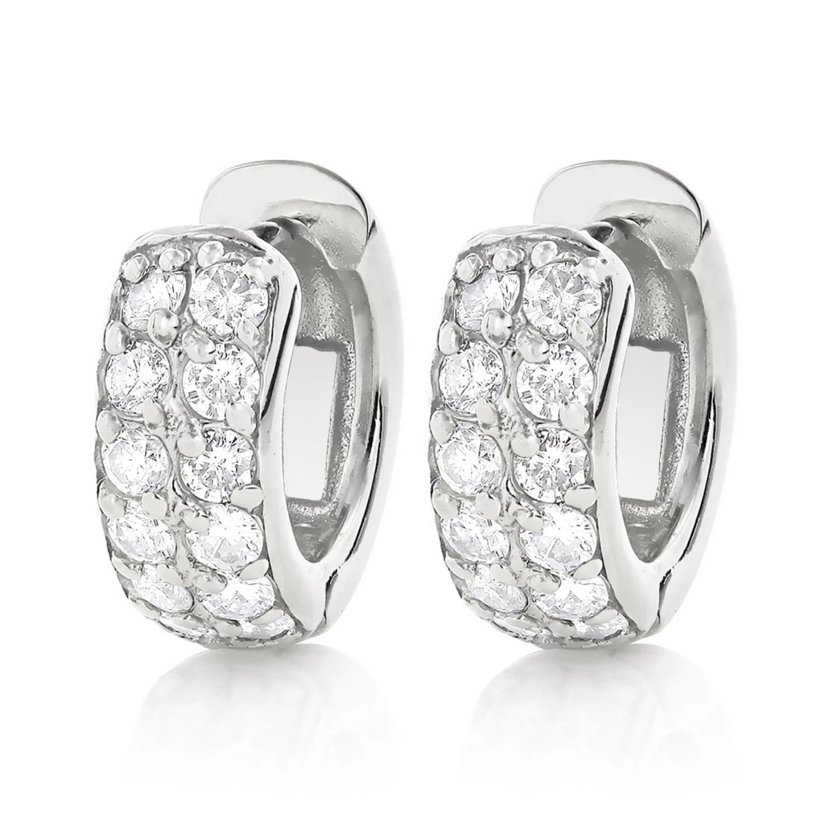 Versatile Diamond Hoop Earrings! These 14K Gold Diamond Huggie Earrings weigh approximately 5 grams and showcase 1 carat of sparkling, high quality round diamonds, each masterfully set in lustrous gold frames. Featuring a classic 2-row design and a highly polished gold finish, these exquisite mini hoop diamond huggie earrings are available in your choice of 14 Karat white gold, yellow gold, and rose gold.