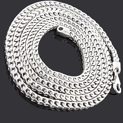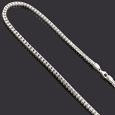 This Italy Made Franco Chain in Sterling Silver (3mm wide) is a squared off chain and weaved together for a luxurious look. It takes the top of the line craftsman to make this silver chain, where each individual facet is welded in a perfect fit for excellent movement and flexibility. This solid Italy made 925 sterling silver Franco chain will not kink and you can even roll it around your finger! It is a polished type chain, yet it catches the light with your every move. This chain is 3mm in width and 36 inches in length. It’s available also in different chain lengths.