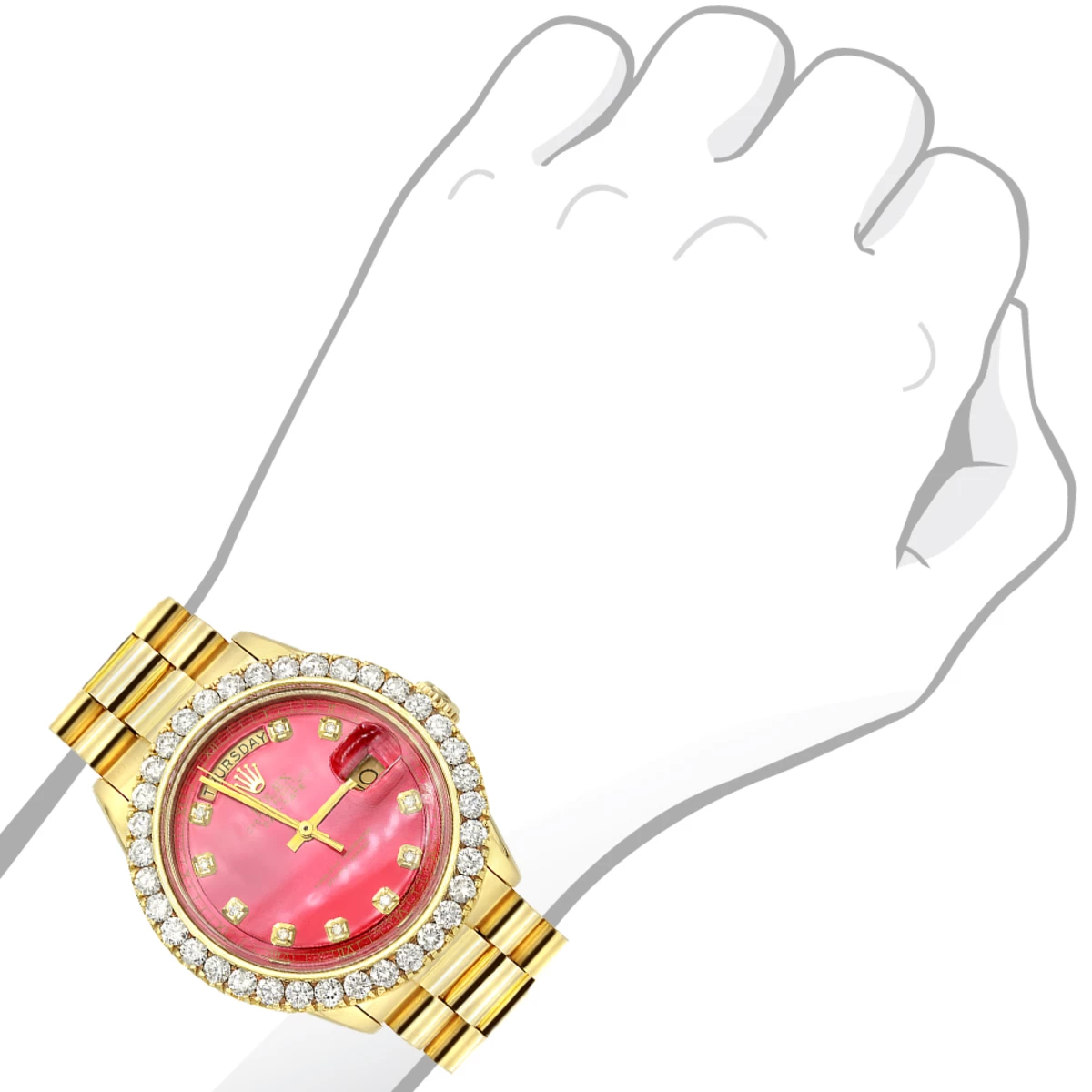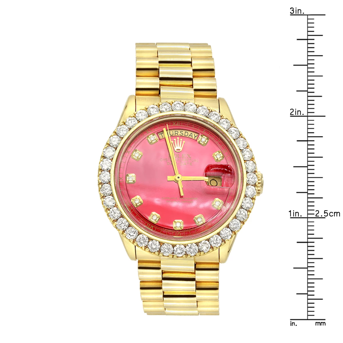Diamond Rolex Watches: this Gold Rolex Watch for Men with Diamond Bezel 4.5ct Day-Date Oyster Perpetual is pre-owned, in excellent condition, and features a 37mm bezel and a very unique red dial with diamonds and a date display at the 3 o’clock position. This custom Rolex diamond watch for men is pre-owned, in excellent condition, and comes with an original Rolex box and a 5-year warranty from ItsHot.com.