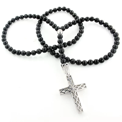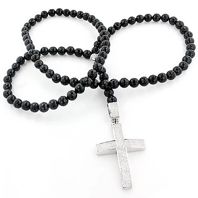 Hip Hop Jewelry: This Disco Ball Diamond Cross Rosary Necklace showcases faceted black beads and a 1.75-carats diamond cross pendant in sterling silver. This unique Disco Ball rosary necklace is a trendy, new accessory.