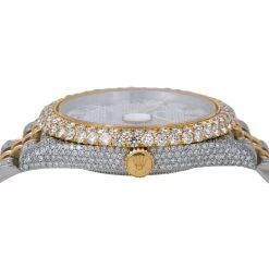 From our iced out watches collection This eye catching 17.75 Carat Bust Down Rolex Diamond Watch For Men is featuring a popular 41mm case made in two tone of yellow gold and shiny white stainless steel and a two tone jubilee bracelet. It’s dazzling ambiance will make each day more bright and special even for the most demanding connoisseurs. Featuring a fully iced out look, this one of a kind Rolex watch has an intricate encrusted dial with 11 unique colorful roman numerals and a date window positioned at three o’clock. An exquisite bezel with bigger white round diamonds is creating a scintillating circle around the cheerful dial. This men’s Rolex watch with custom set diamonds is pre-owned, in excellent condition and comes with a box with a full 5 year warranty from ItsHot.com.
