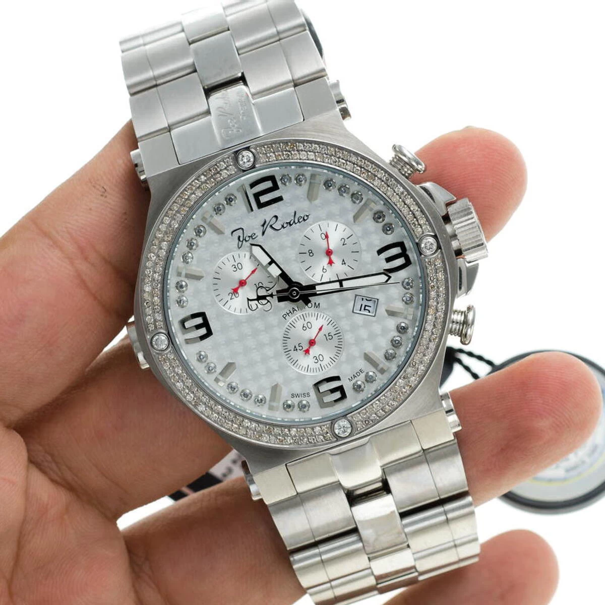 Fine Diamond Watches Collection by Joe Rodeo! This luxurious JoJo Joe Rodeo Phantom watch features 2.25 carats of diamonds, a stainless steel case, scratch-free crystal glass and black stainless steel band. This men’s diamond watch by Joe Rodeo has two rows of white sparkling diamonds around the bezel. The watch also features brushed Silver Stainless Steel dial with three silver tone sub dials, Silver tone hour markers and a row of sparkling white stones around it. Super accurate Swiss-made quartz movement with chronograph function will keep the time for you. Water-resistant 100m (330 ft).
