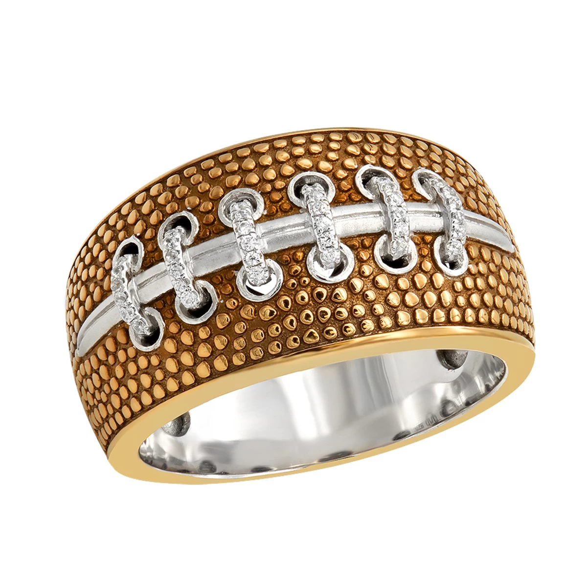 This American Football inspired ring from the LuvMyJewelry Adrenaline Rush Collection is your perfect NFL & College Football game day companion. This men’s diamond ring is beautifully presented with the inspirational poem “Adrenaline Rush”. Crafted in 925 Sterling Silver, this edgy diamond sports ring mimics the look, feel and texture of an American Football. The stitch pattern is studded with 1/8 carats of 100% genuine diamonds in a split scallop prong setting. This ring is plated in brown rhodium to give the American Football color & glimmering finish.