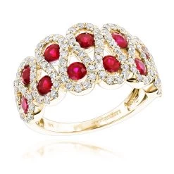 This Luxurman Diamonds and Ruby Ladies Cocktail Ring showcases 1 carat of dazzling round diamonds and 1.6 carats of red rubies masterfully set in 14K gold base. Wonderful design and outstanding craftsmanship makes this gorgeous diamond gemstone ring for women a great present for any occasion! This unique diamond ring is available in 14K white gold, yellow gold and rose gold. Matching diamonds and ruby earrings are available below.