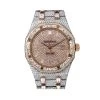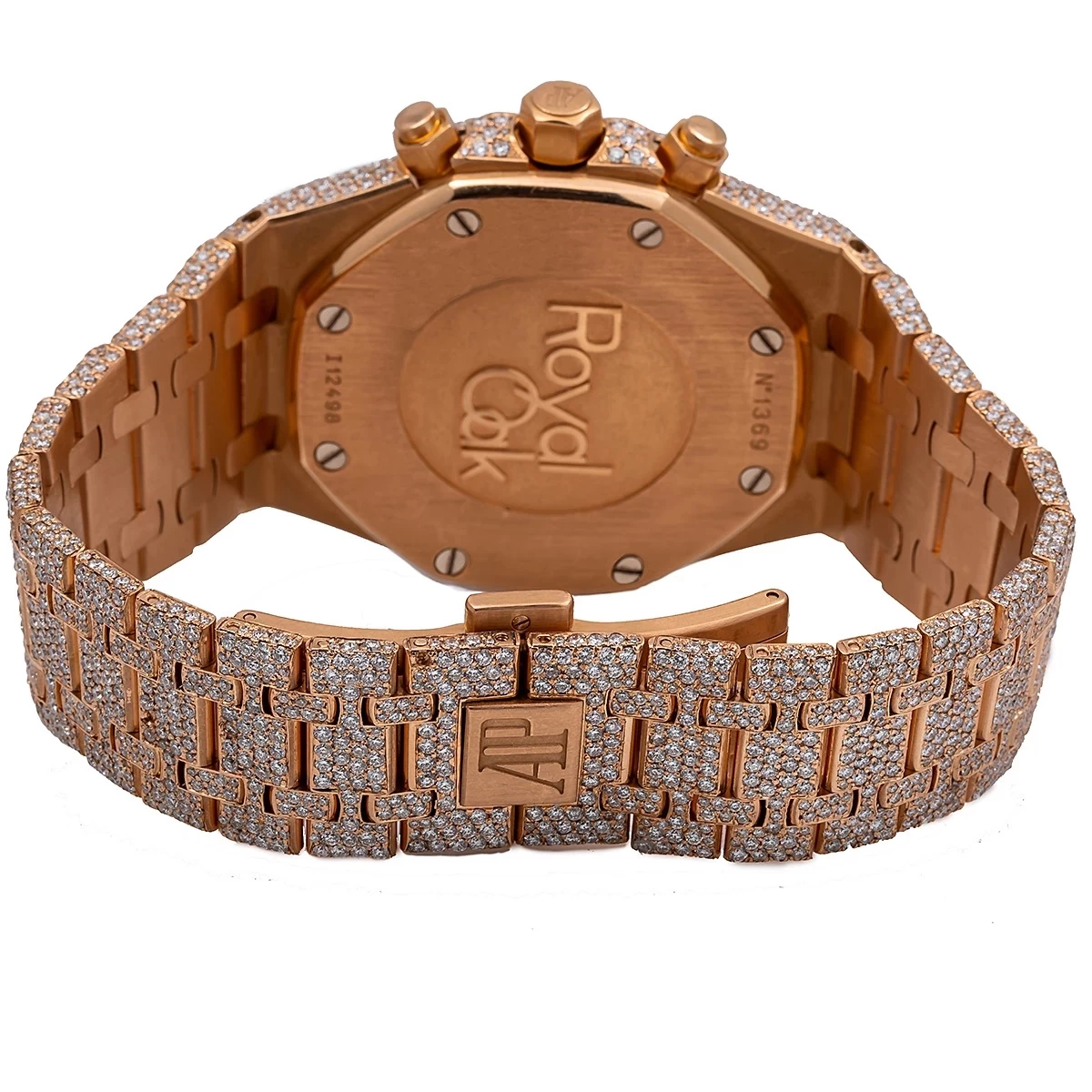 This unique diamond Audemars Piguet diamond watch for men from our iced-out watches collection is a popular Royal Oak model, made in rare 18k gold; the watch has a 41mm case and is fully iced out in 21.7 carats of sparkling diamonds.