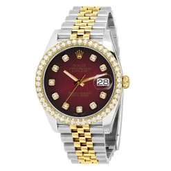 Men’s Gold Rolex Datejust 41mm Dark Red Dial Jubilee Bracelet Diamond Bezel. This diamond Rolex watch is pre-owned, in excellent condition, and comes in a Rolex box with a full warranty from ItsHot. Customize the look of the watch if you prefer with diamond bezel or fluted bezel. Each watch can be additionally customized with diamonds on the case as well as band (please contact us for details).