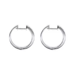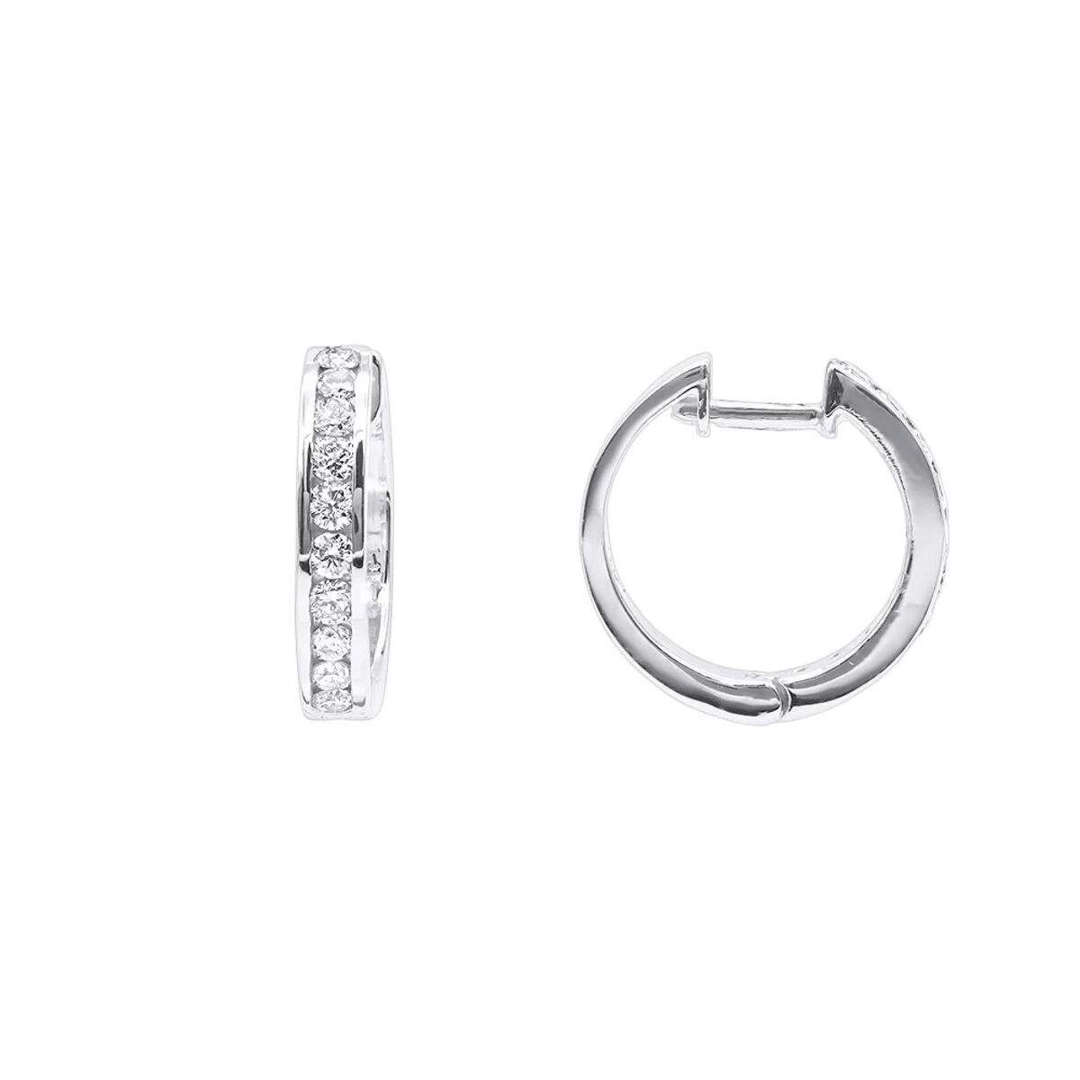 These sparkling Small Diamond Hoop Earrings For Men and Women in 14k gold showcase 1/2 carats of round channel set diamonds and can be worn by both men and women. Featuring a classic design and a bright polished gold finish, these lovely huggie earrings are about 15mm in diameter (5/8in) and about 2mm wide (1/16in), available in 14K white, yellow and rose gold.
