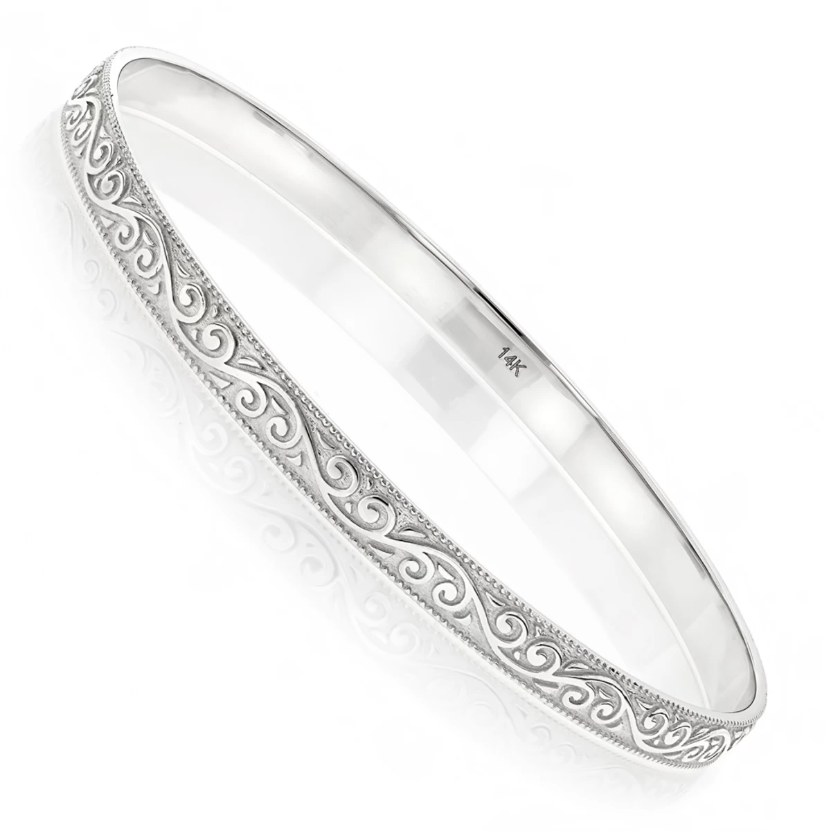 This stylish 14K Gold Bangle Bracelet for Women by LUXURMAN showcases highly polished solid gold with a very original and unique floral design. This gorgeous gold ladies bangle bracelet features an intricate design and a highly polished gold finish, the bracelet is 3/16 of an inch (5mm) wide and is available in 14K white, yellow and rose gold. The bangle can be made in diameters 2.25in, 2.5in and 2.75in.