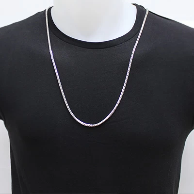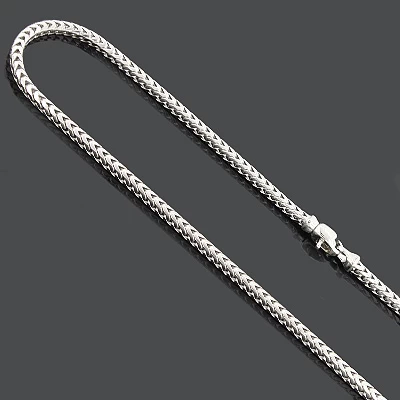 This Sterling Silver Franco Chain Necklace (3mm wide) is a squared off chain and weaved together for a luxurious look. It takes the top of the line craftsman to make this silver chain, where each individual facet is welded in a perfect fit for excellent movement and flexibility. This solid Italy made 925 sterling silver Franco chain will not kink and you can even roll it around your finger! It is a polished type chain, yet it catches the light with your every move. This chain is 3mm in width and 30 inches in length. It’s available in different chain lengths.