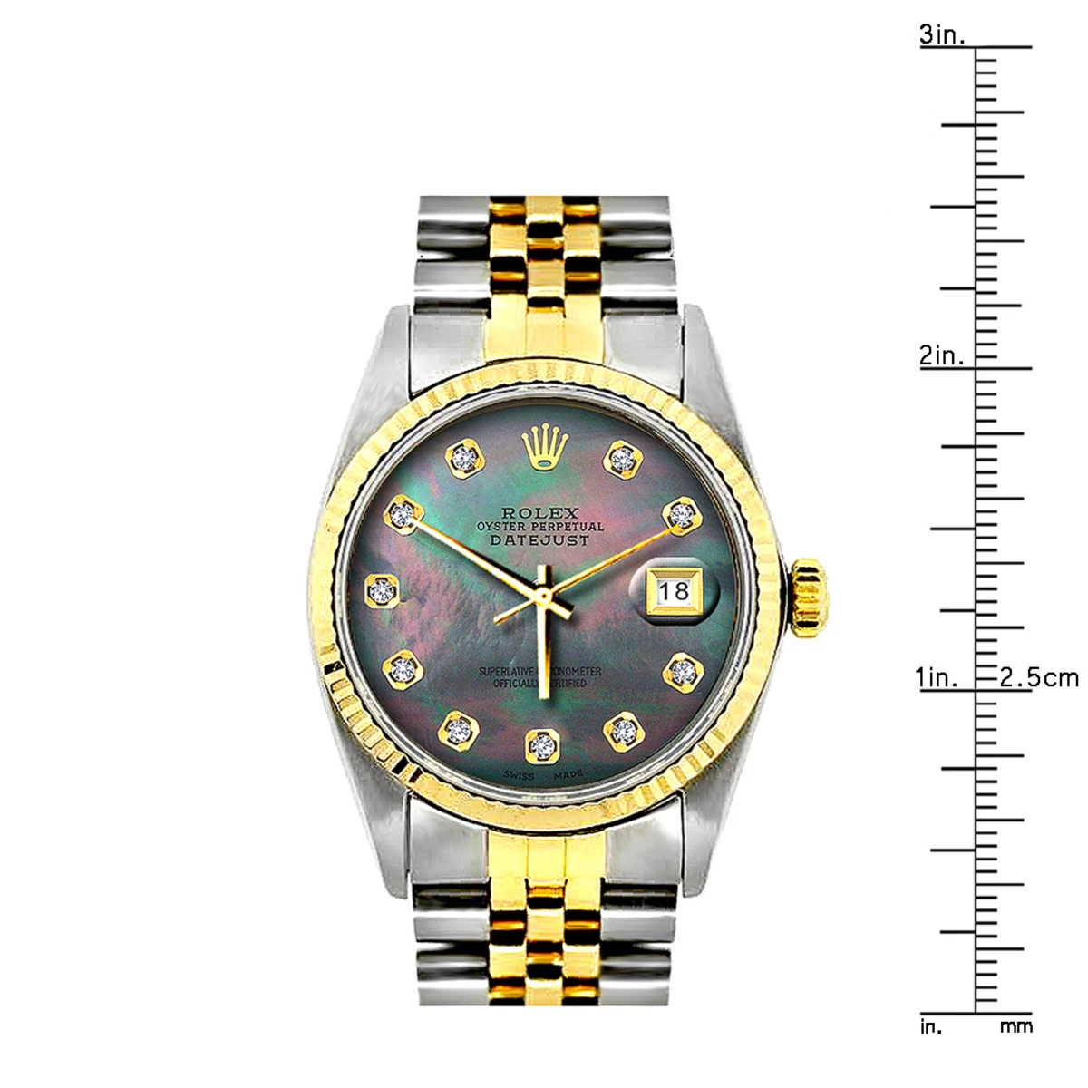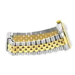 This is a high-end-looking men’s diamond watch. Two-tone Rolex Datejust 36mm Diamond Watch for Men. Stainless Steel & yellow Gold features a black mother of pearl dial with 0.1 carats of dazzling round cut genuine diamonds, a brushed stainless steel case, a yellow gold bezel, and a two-tone Jubilee band. This Rolex Diamond Watch for Men showcases a very eye-catching black mother-of-pearl dial and a date display at the 3 o’clock position. Please note: this custom Rolex diamond watch is pre-owned, in Like New condition, and comes with a 5-year warranty from ItsHot.com.