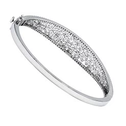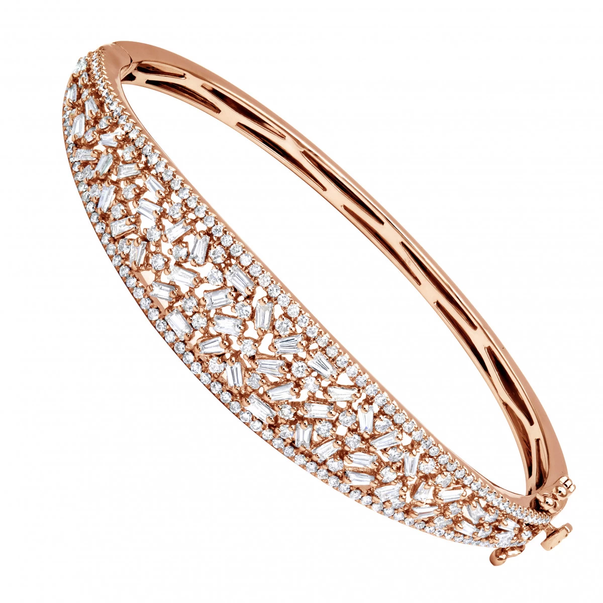 This gorgeous sparkling diamond bangle bracelet for women by LUXURMAN is truly unique and features rows of round miracle diamonds on both sides of the bracelet accentuated with the dramatic sparkle composite of round and baguette diamonds in a unique pattern in between. Total carat weight of diamonds is 3 carats, the bracelet is 12mm wide in the center and is available in 14K Yellow, White and Rose Gold. The bracelet fits any daily or evening attire, its beauty represents the elegance and chic. This stunning ladies diamond bracelet is ‘must –have’ addition to your beautiful jewelry collection!