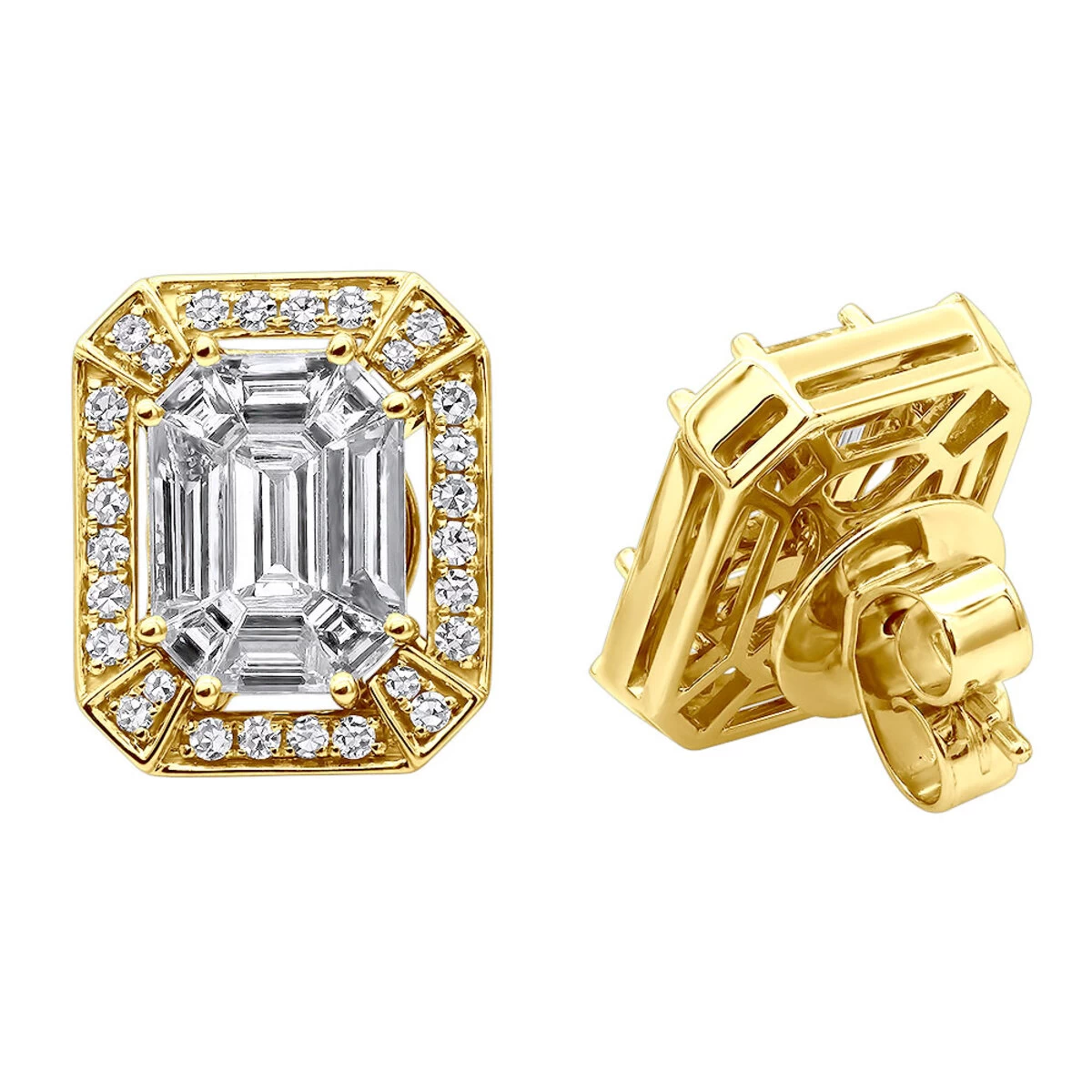 These gorgeous 18K Gold Emerald Cut Diamond Stud Earrings showcase 2.5 carats of VS sparkling genuine diamonds. Featuring a unique design with a halo decorated with white round diamonds and secured with push back closures for safe wear, these beautiful earrings are available in 18K white, yellow and rose gold. Wear these stud earrings with halo or without!