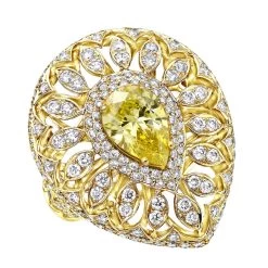 From our women’s diamond rings and unique jewelry collections this gorgeous and highly unique Pear Shape Yellow Diamond Cocktail Ring with White Diamonds is made in 18K Gold and features 1.7 carats of round white diamonds and a 1.7 carat yellow diamond in center. The timeless silhouette of the pear shape accentuates the beautiful yellow hue of the prescious stone in the middle while the intricately crafted band creates a scintillating pear-shaped frame around the remarkable center. The diamonds are scattered on the surface of the ring in such an amazing way that they resemble the chic tail of a proud peafowl. There are also white round diamonds stylishly set on the sides of the highly polished 18K gold band. This ladies diamond ring is quite large being 7/8in (23mm) long and 1 1/8in (28mm) wide. Such an exceptional design makes this wonderful ring a perfect present for a special occasion and will be a striking addition to any outlook and an amazing present to a very special lady. Available in 18K white, yellow and rose gold.