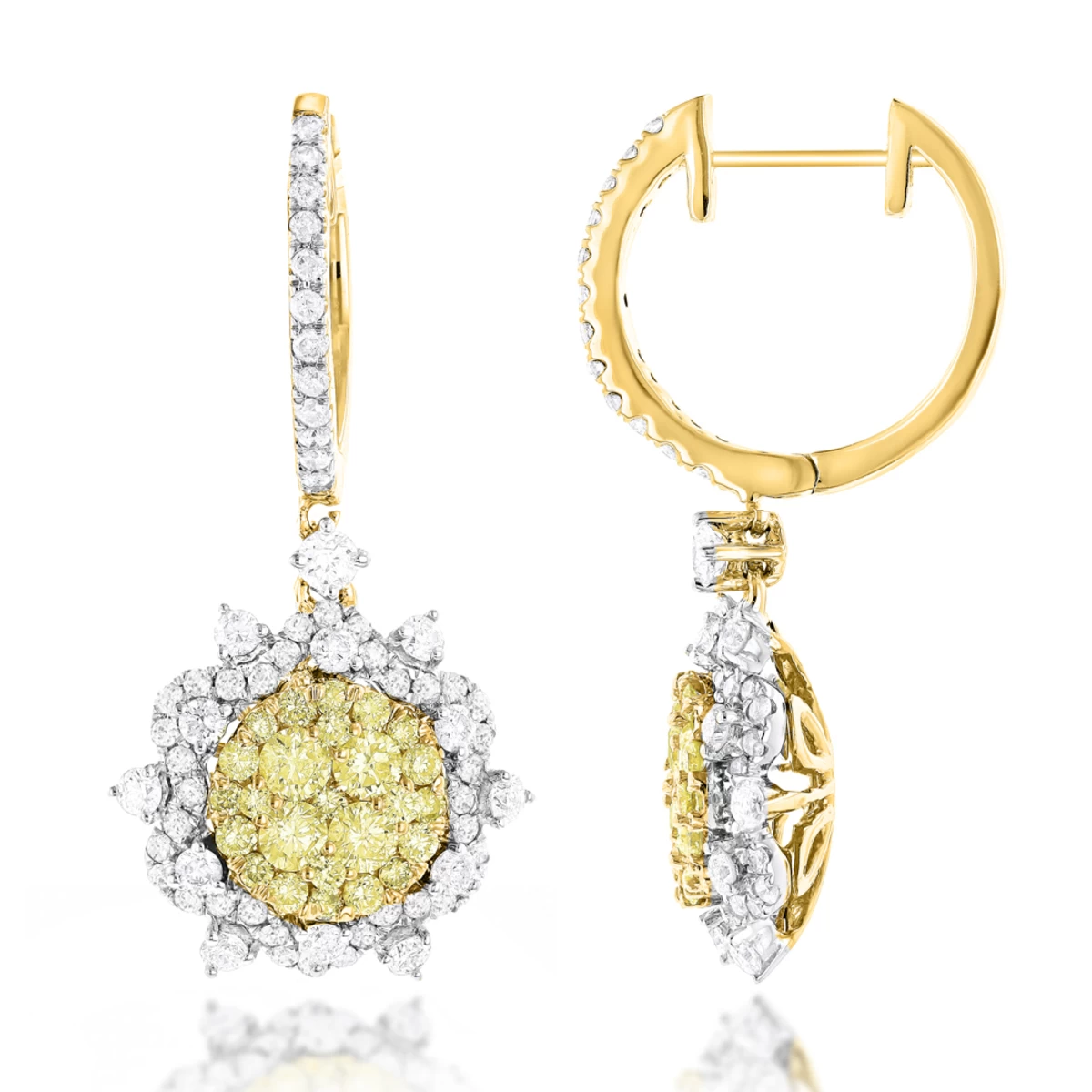 These Unique Designer Ladies White Yellow Diamonds Flower Drop Earrings by Luxurman featuring a unique flower design and 2.75 carats of dazzling yellow and white diamonds masterfully pave and prong set in 14K solid gold. Beautiful flower gallery on the back and unique design make this pair of diamond drop earrings wonderful present for any occasion. These designer women’s diamond earrings are available in 14K white gold, yellow gold and rose gold. Matching white and yellow diamond flower ring and pendant are available below.