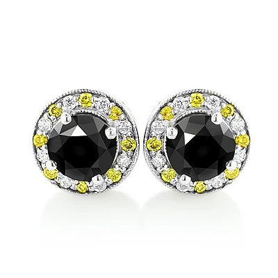 White Yellow And Black Diamond Stud Earrings 2.20ct 14K White Gold